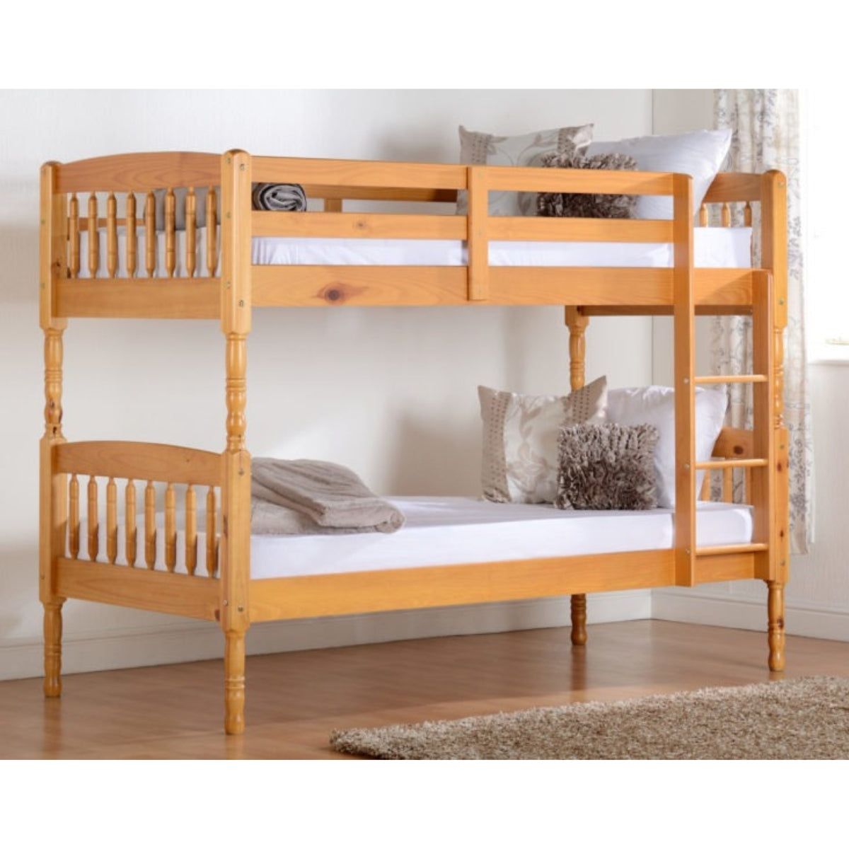 The Albany bunk is crafted from solid pine to come alive in contemporary and traditional bedrooms with its classic antique pine finish and elegant spindle details. This bunk bed is equipped with guard rails and a fixed ladder. It can also be split into two standard UK single beds.