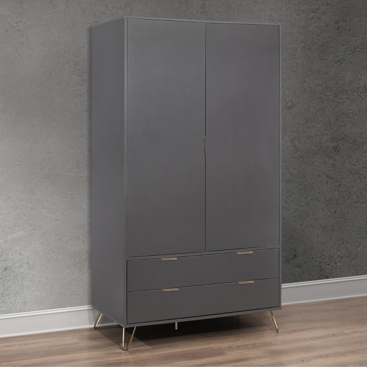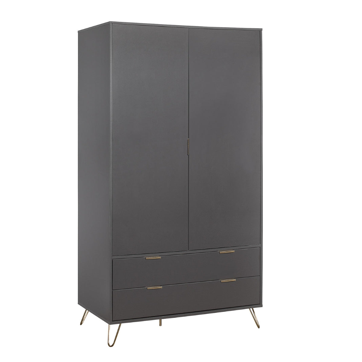 The Arlo's stylish matte grey finish imbues any bedroom with a sleek, modern look, accented by gold handles and hairpin legs that are sure to make an impression. Its four doors provide ample space, enhanced by internal shelves and two handy drawers for storing clothing and accessories. Each piece is carefully crafted from particle board and coated with a sleek grey effect finish.
