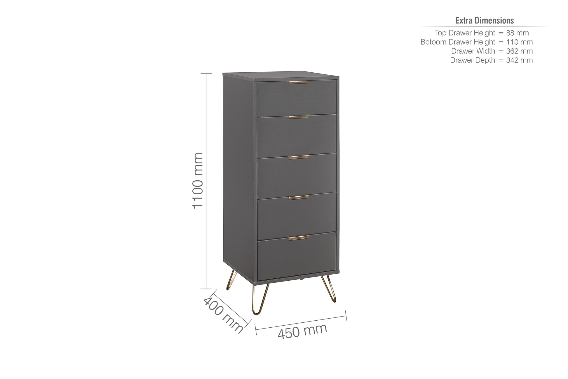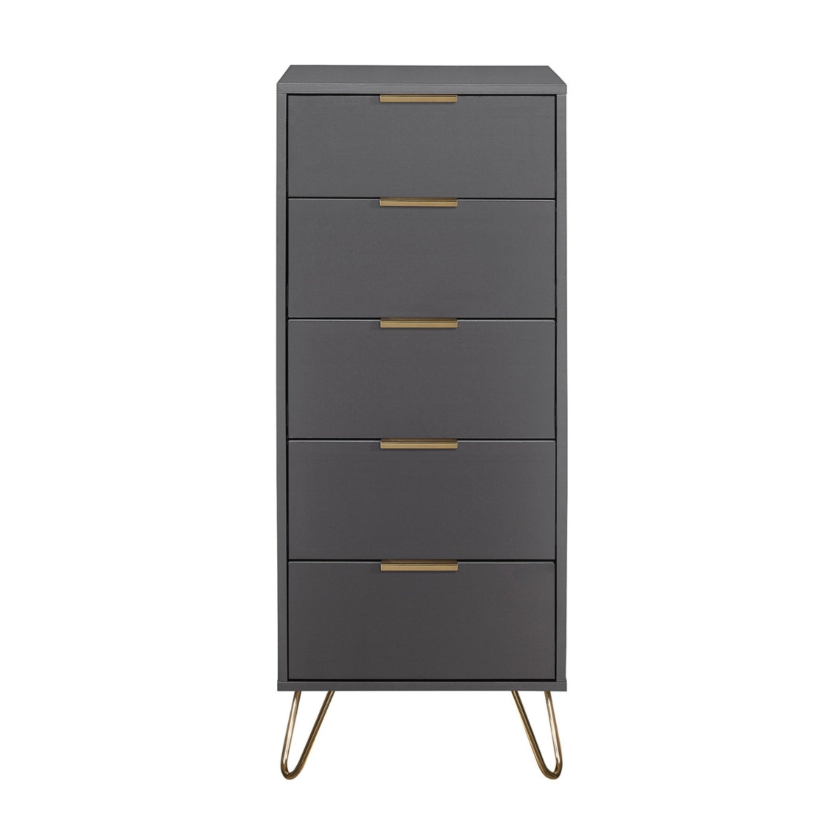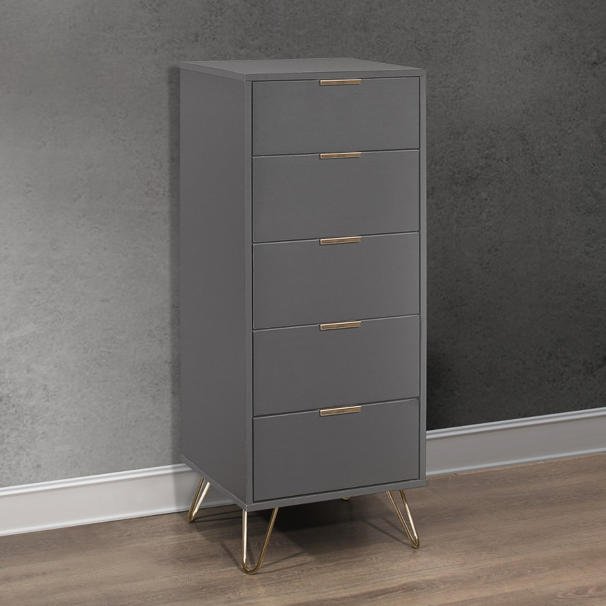 The Arlo 5 Drawer Narrow promises a sophisticated, contemporary look to any bedroom with its trendy matt grey finish, golden accent handles, and fetching hairpin legs. Boasting four generous drawers, this durable particle board piece is perfect for discretely keeping your belongings organised.