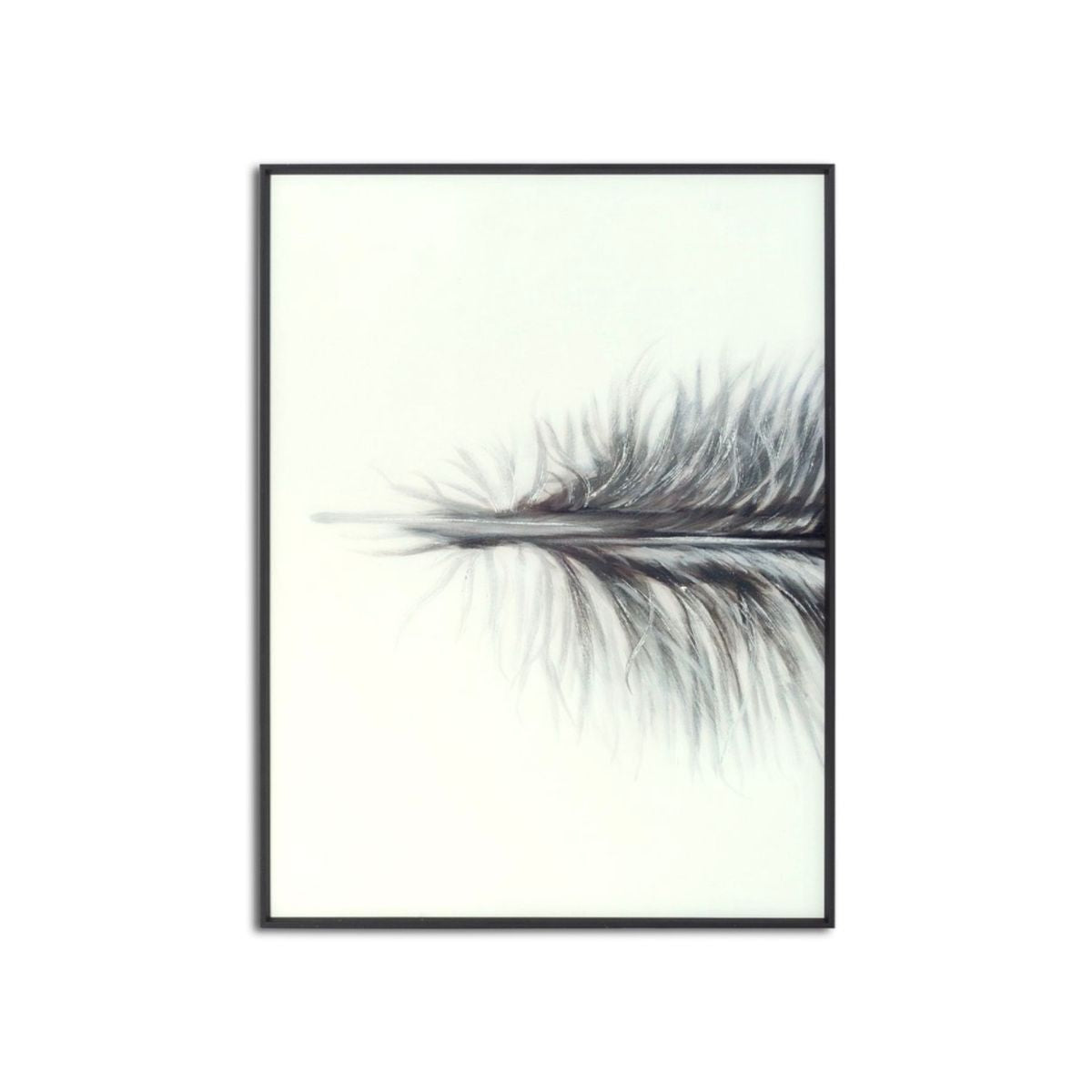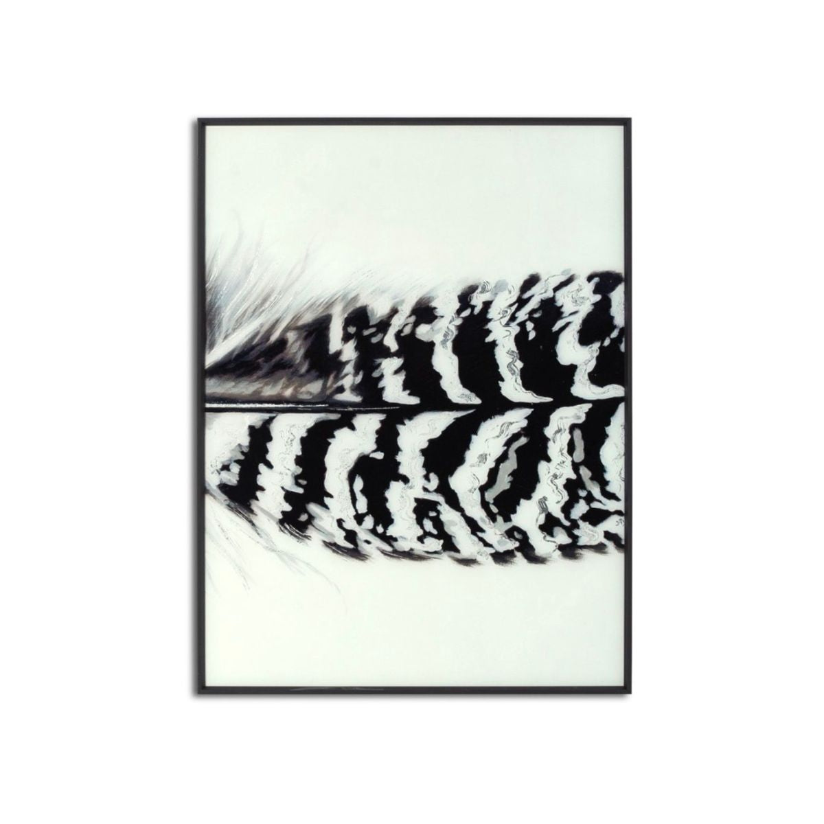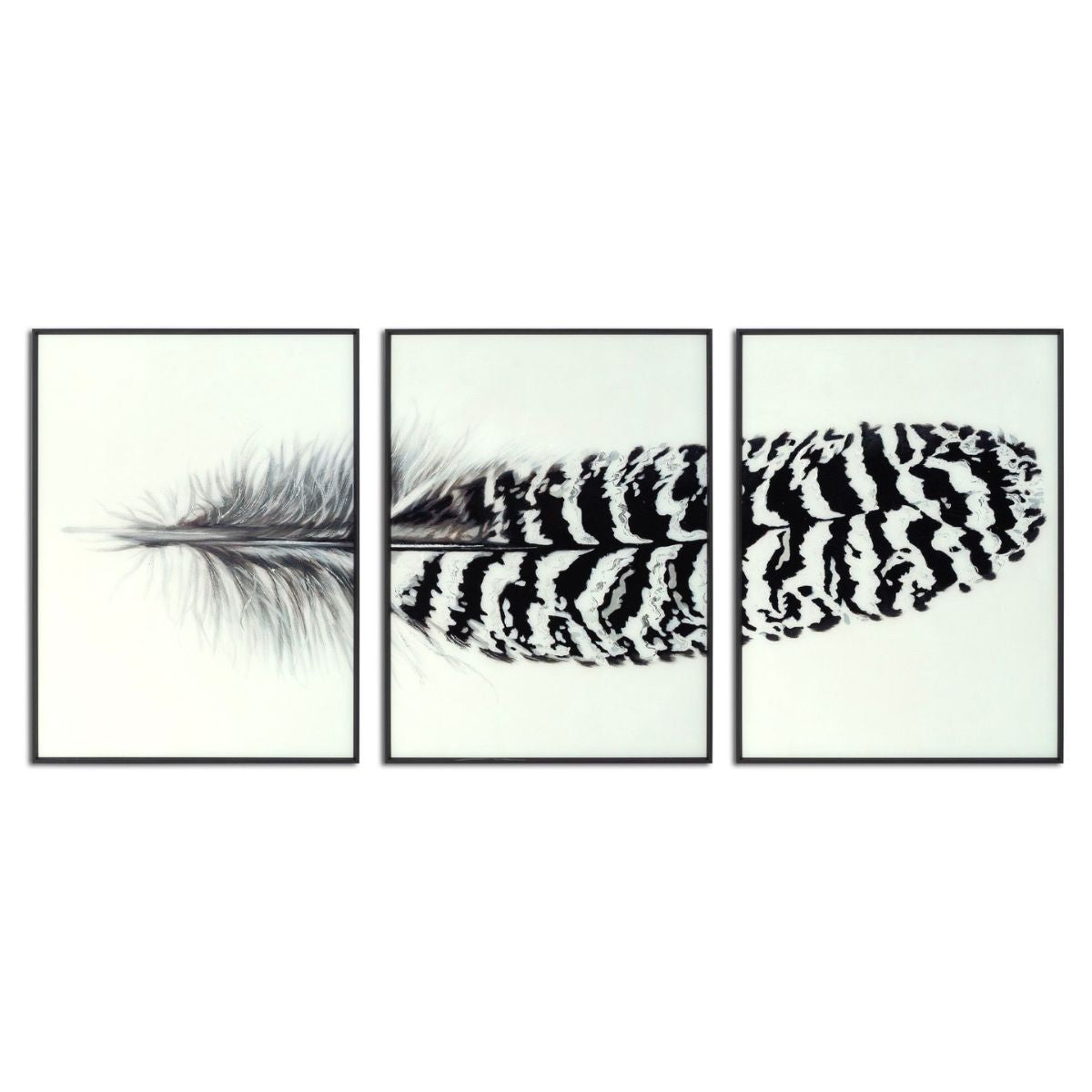 Elevate your home décor with this handcrafted, black and white striped feather art, framed in three black glass frames. Perfect for filling up a hallway, kitchen, or living room wall, this stunning artwork provides a bold contrast for a dramatic look. Create a unique, one-of-a-kind display by arranging the frames in a vertical or horizontal orientation.