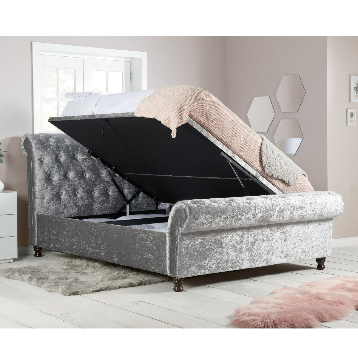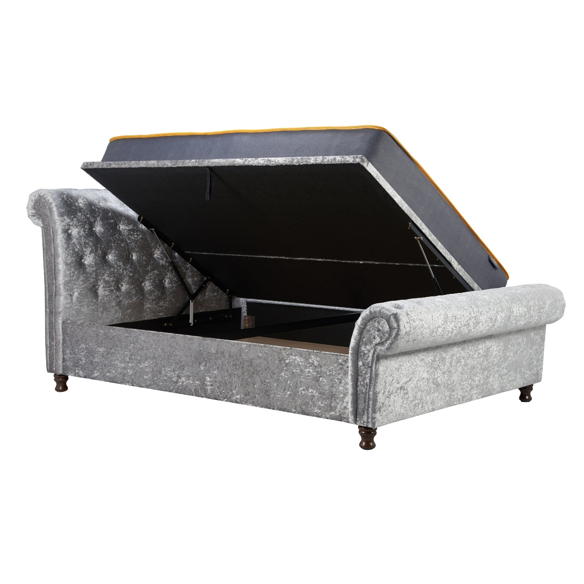 Our Castello Super King Side Ottoman ensures style and practicality with its luxurious crushed velvet upholstery and adjustable gas lift arms. You can rest easy knowing this sturdy bed frame is capable of supporting mattresses weighing up to 65kg and can handle a total maximum weight load of up to 450kg! Plus, it comes with a protective base board for added durability and peace of mind. Sleep soundly with our Castello bed!