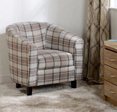This modern, compact tub chair boasts a fixed foam seat base for increased comfort, and is upholstered in a grey and brown tartan fabric. It is suitable for multiple settings and comes with wooden feet, MDF components and foam padding. Includes 1 year guarantee.