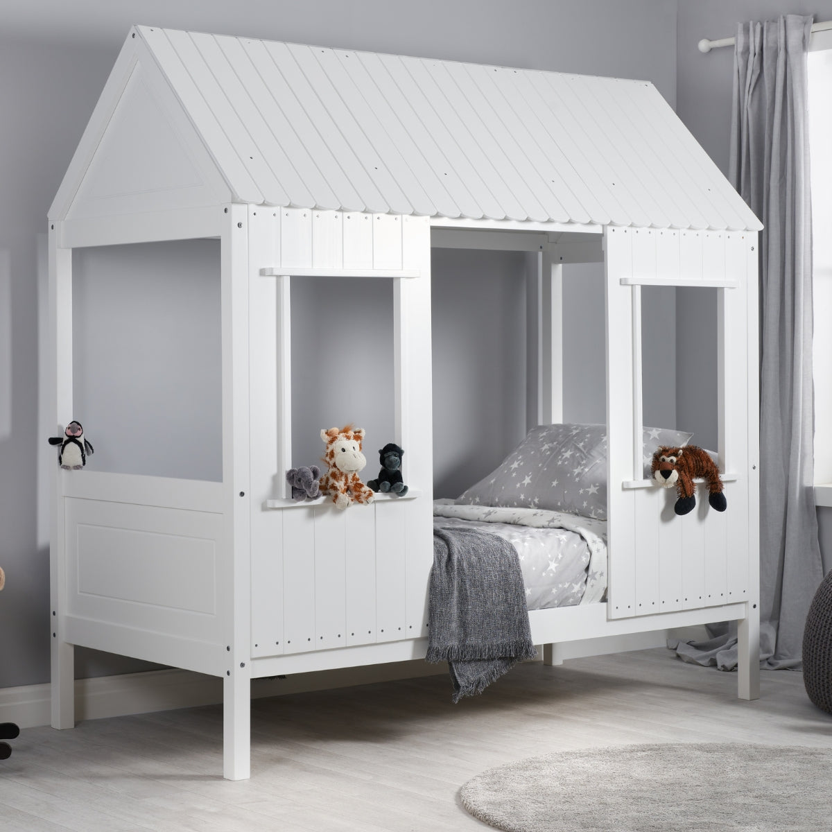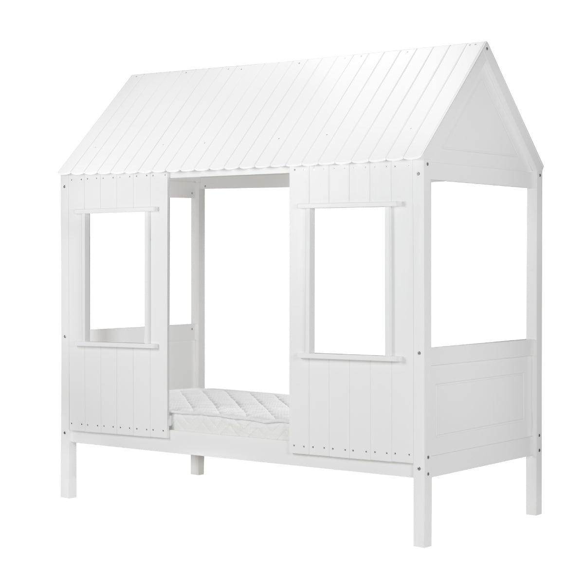 Create an adventure-filled bedroom for your kids with the Treehouse Bed White! This playful yet stylish bed is perfect for your little adventurers, boasting a country-style cladding and traditional pitch roof for a cosy hideaway. Underneath, you'll discover plenty of storage for all their toys! What's more, the solid slatted base ensures maximum support and is able to hold a maximum weight of 100kg, so your bed won't be a flop. Take the plunge and get them their ideal dream bed!