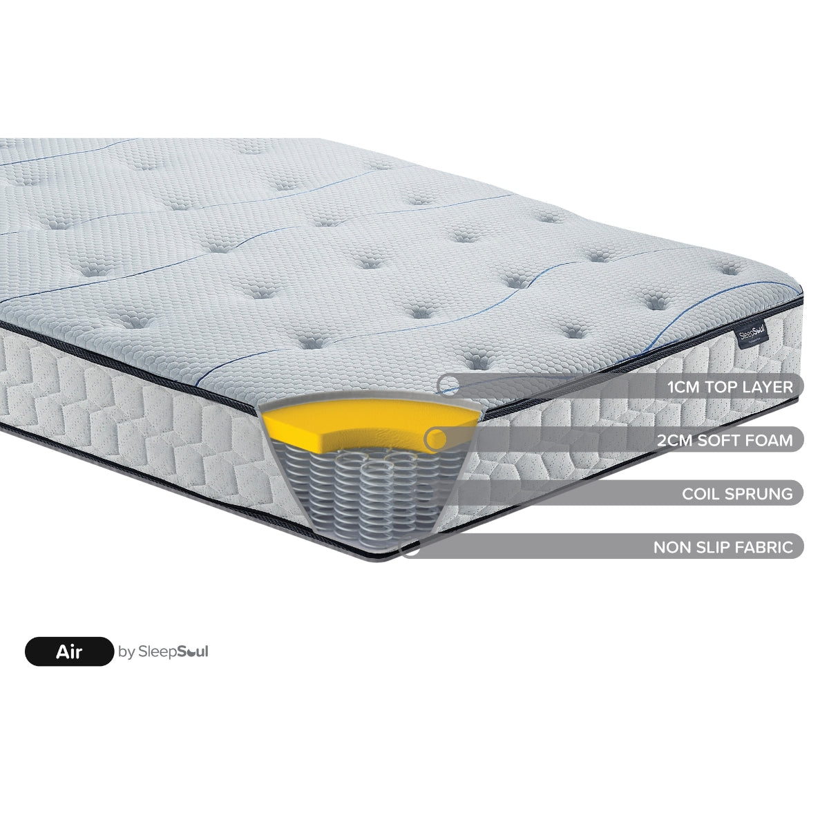 Experience the ultimate comfort and support with the SleepSoul Air single mattress. Its traditional open-coil spring system and luxurious comfort quilting provide the perfect balance for a peaceful sleep. Say goodbye to 'roll-together' and hello to evenly distributed weight and stability. Comes rolled up for your convenience.