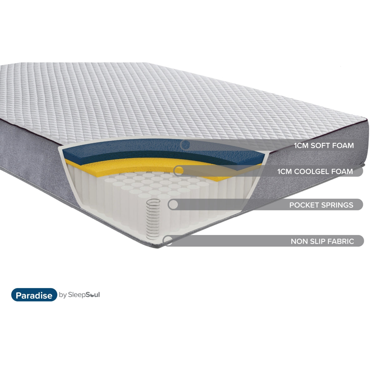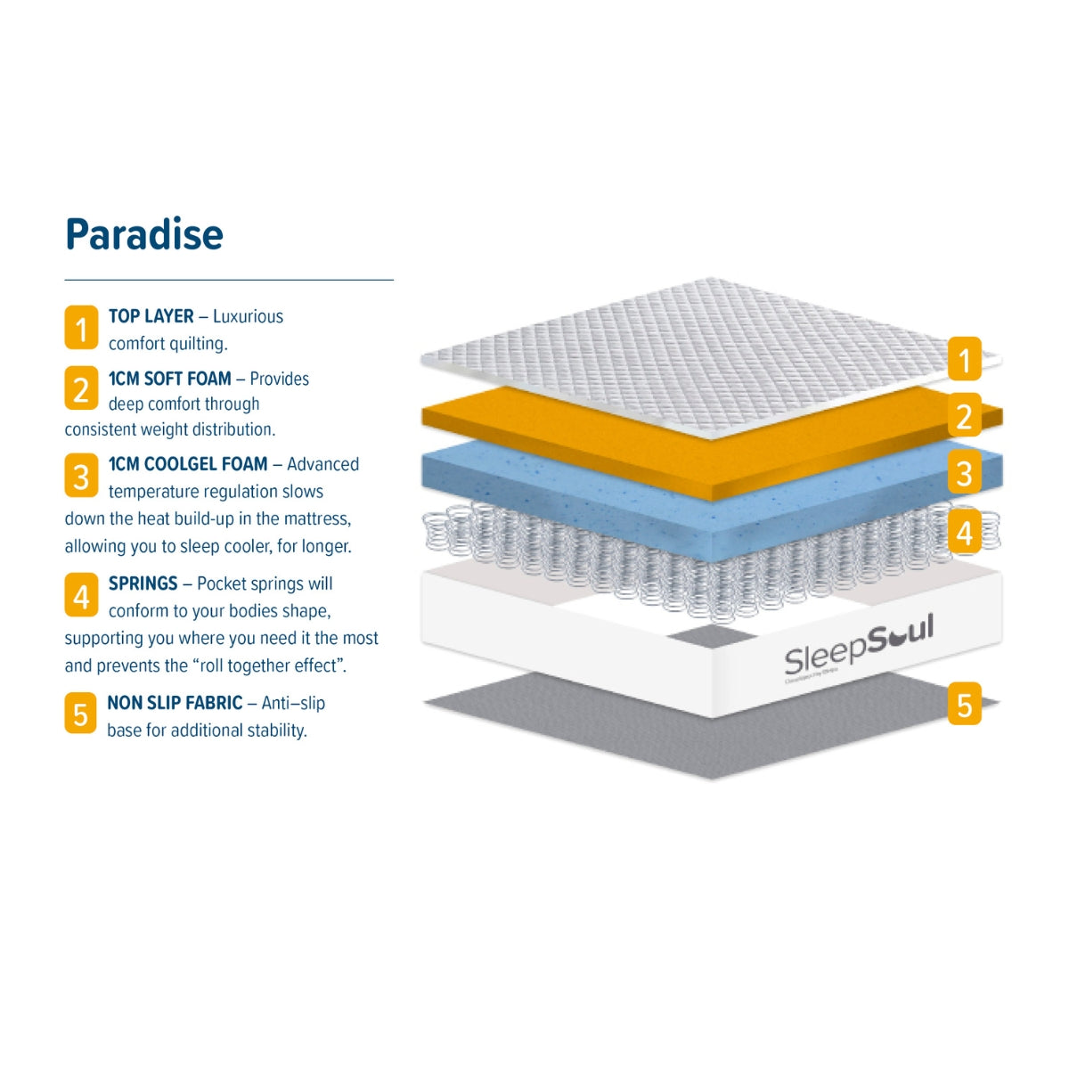 Experience a cool and comfortable night's sleep with the SleepSoul Paradise Double Mattress. Combining foam and springs, this mattress offers exceptional support and a light, airy feel. The coolgel top evenly distributes weight and regulates body temperature, ensuring a peaceful sleep for you and your partner. Say goodbye to restless nights and hello to well-rested mornings.